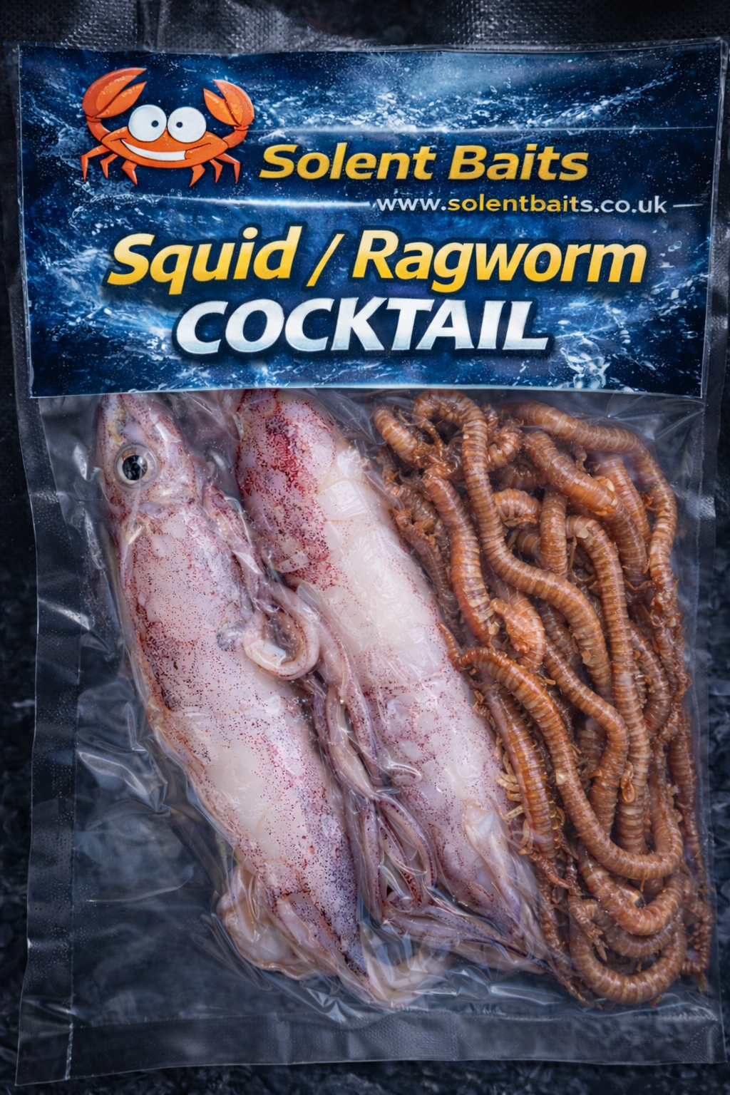 Our Squid and Ragworm Cocktail is made in-house at Solent Baits, combining a whole squid with premium ragworm for a powerful, scent-loaded sea fishing bait.